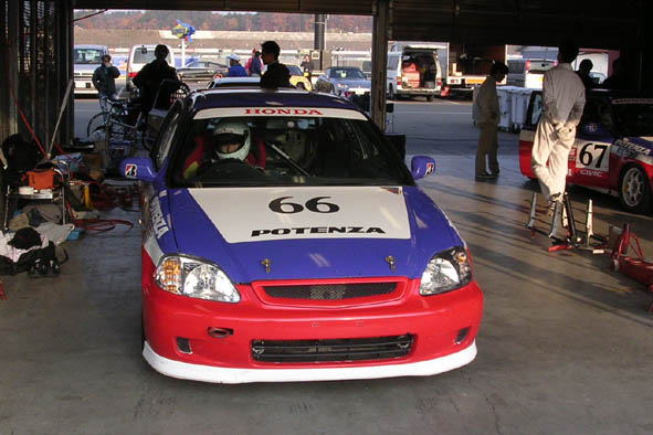 この日の主役にして一番カッコ良かったのが、渡辺さん組のインテグラ。金曜にクラッシュで全損になったあと、走っていなかったボディを静岡から取り寄せ、午前2時から移植手術を開始し、予選ポールポジション!