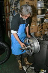 ちなみに京葉サービスは入口からこんなカンジで、しかもちょっと通りから奥なので、素人お断りの雰囲気バリバリです。 阿倍さんも絵に書いたような職人オヤヂでやっぱり素人お断りの雰囲気バリバリです(笑)。でも雰囲気だけで別に怖いってこともないし、話がとにかく面白いので、興味のある人はぜひどうぞ。クラゴン部屋に来られる人だったら大丈夫です。だいたい敷居の低い職人のオヤヂなんかいたらニセモノだべさ。敷居は高くて当然。その敷居を突破した人がオイシイ思いをできるってことでいいんじゃないでしょうか。 一番多い仕事は、ドレスアップ系でインチアップしすぎちゃったのとか、他で「どうしても振動が出てどーにもならない」っていうのを何とかすることだそうです。 組み換えだけでもいいけど、タイヤも信頼性の高いのを買えるし、中古タイヤの販売もやってるそうです。1本だけフラットスポットを作っちゃったなんてときにもいいかも。スタッドレスタイヤも中古販売しているそうです。 場所は千葉方面から行くと、京葉道の篠崎で下りてすぐ、左側に見えるコスモのスタンドの手前の道を左に入ってすぐ左側…だったかな(爆)。道を覚えないなオレ。仕入れに出ていることもあるそうなので、必ず事前に電話を入れてください。 京葉サービス 東京都江戸川区篠崎6−23−5 TEL 03−3698−4733 |