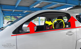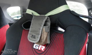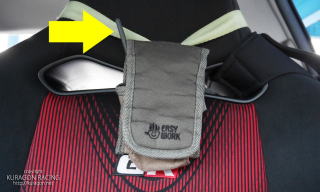 高い位置で固定できるなら、ヘッドレストでも、シートのベルト穴でも、ピラーのベルトのキャッチでもどこでもOKです。 |