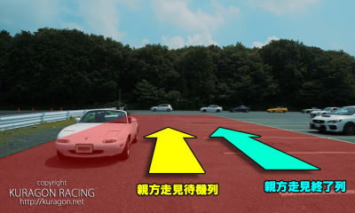 12時までは写真右端の壁側に駐車してください。12時以降、右の写真の赤い部分、最もコースに近いところを空けて駐車&荷物を置いてください。あまり離れると移動が大変だと思いますので、壁沿いではなくおおまかにこの写真のみなさんの位置がいいと思います。