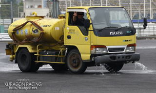 梅雨時ですから雨が降ればそれでOK。雨が降らないときのために、散水車の予約もしてあります。散水車なら、狙ったところだけウエットにできるし、それはそれで面白そう。雨が降らないときは、どこをウエット区間にするかでまた鍛錬の様相が変わって楽しいんですよ。