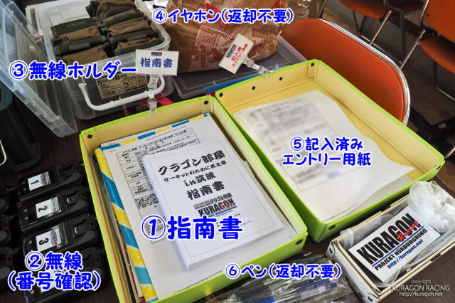 ・指南書、無線、ホルダー、エントリー用紙など手渡しをしない。