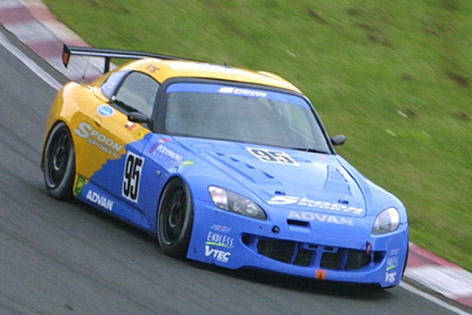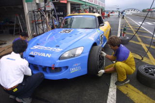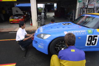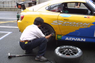 今まで白いクルマ(=ノースポンサー)ばっかりだったから、カラーリングしてあると、オレが乗ってるって気がしないね。それもスプーン色だからなおさら。ピス兄もスプーン色のマシンに昔から乗りたかったとおっしゃってました。 |