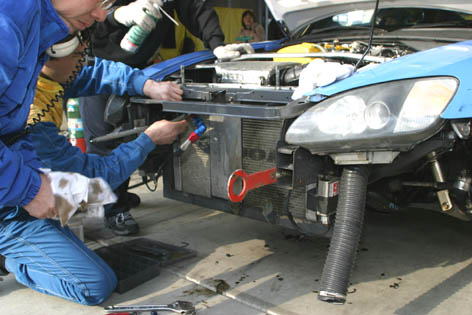 修理を外で待っていると寒いのでマシンに乗りこんで待ってました。冬は室内にバコーンと突き出てるミッションがあったかいんだ。 待ってる間 大井さんは 「止まってる時間は個人的に引いといてやるから。」 所長は 「ベストラップ出してキッチリオイシイところもらってこい!」 オトコふたりそれぞれの言葉で激励ごっつあんでした! ラスト約30周、オイルクーラーなしでコースに復帰。 クラス1位から16周遅れのクラス12位、総合38位。 |