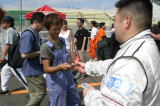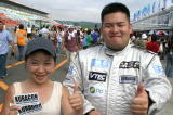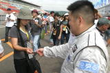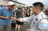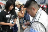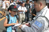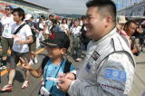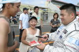 やっぱり北海道は熱いぜ!! 今年はホントに暑かったけど。レースのあんまりない北海道のファンは、この24時間を遊び倒してやるぞ〜! という気合がバリバリです。 去年サインしてあげた帽子を今年も持ってきてくれた人はいたし、最初からオレ目当てで来る人もけっこう多くて、サインいっぱい書いちゃった。 面白かったのは写真2段目右側の子でさ。「サインちょーだい」と来たのはいいんだけど、柘植さんの「コイツ(オレのことね)誰だか知ってる?」の質問に思いっきり「知らん!」とか言われちゃった(笑)。 名前も知らないけど何となくサインをもらおう、と思われた時点でオレの勝利! 子供は正直だから人を見分けるからね。「知らん!」には大爆笑だったけど(笑)。 ピットウオークっていうとみんなキャンギャルだから敢えて載せません。 ピットウオークが終わったらすぐコースインでグリッドにつきます。 |