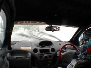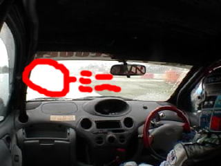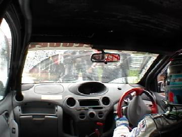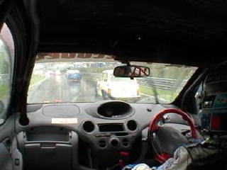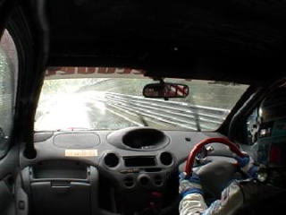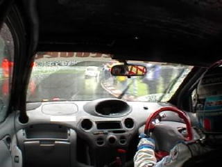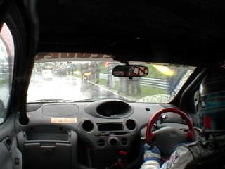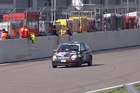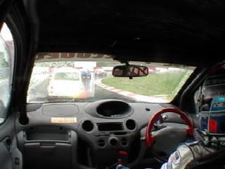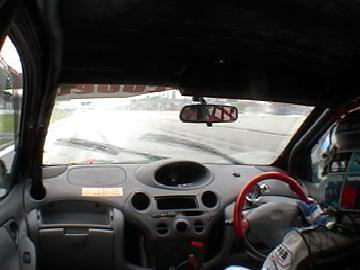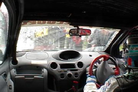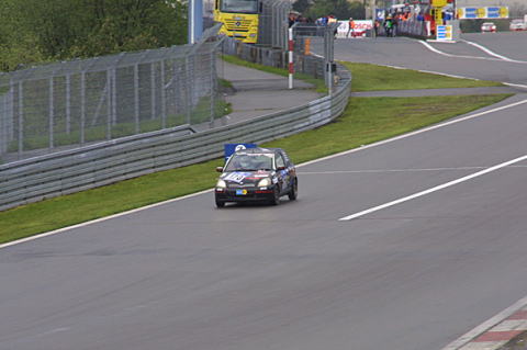 目の前で熱狂的に応援されるミニクーパーに対抗して、気合の右ハンドル車でファンの心をごっつあんです! 「いいから黙ってスタートやっとけ」というO井さんのアドバイスはコレだったんですね〜。もちろんオレがスタートをやるしかない状況だったけど。日本じゃ絶対できない経験でした。 調子に乗ってハイタッチしまくってたら、コースマーシャルの人に早く行けと怒られました(笑)。 |