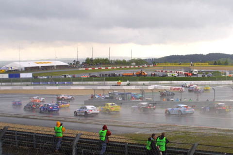 ローリング開始したのはいいとして、このままスタートした日にゃクラッシュ続出でコース上にマシンの山ができることは確実。アナウンスのドイツ語はまったくわかりませんでしたが、スタートはまだまだ先なのはわかってました。 言葉はわかんなくても、そのあたりの呼吸というかなんというか、日本よりもわかりやすいです。 |