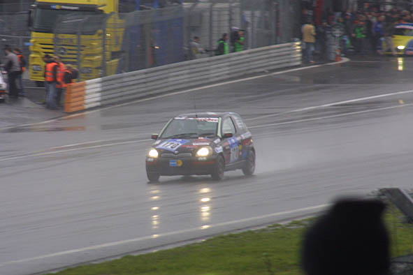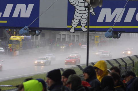 手が出てるの見える? ピットロードやグリッドではなく、オールドコース上です。この雨の中コース内で待っててくれるなんてうれしいし、観客がここまで近づけるレースなんて粋じゃありませんか! 「この雨じゃ恒例のハイタッチはなかったんじゃないか」というウワサがありましたが、プロのレースファンにはそんなことは関係ないようです。さすが本場は違うぜ! |