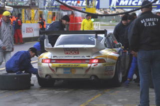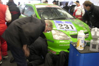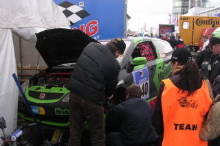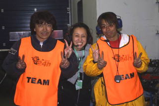 このころだとまだみんなピースする余裕もありますね〜(笑)。 同じピットのフレパーモータースポーツさんち(緑号ね)は緊急ピット&修理の波状攻撃! 最後は裏のテントの前でも修理がはじまってました。 |