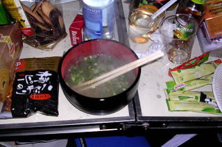 ただしオレの生態エネルギーを供給してくれる売店はお休み。ソーセージを頼むとパンで挟んだゴッツイのが出てきて、それがまた旨かったんだ。英語がわかるオネーチャンがいる時間帯に行かないと、後ろに並んでる人に迷惑をかけるという問題もありましたが。 ソーセージは英語。ドイツ語では確か「WURST」。「ソーセージくれ」って言ってたら、まわりの親切なドイツ人の人が「WURST」って言ってくれました。それも3箇所くらいから同時だったりして(笑)。みんな親切です。 極寒の夜を乗り切るにはやはり味噌汁。こういうちょっとした日本食が精神的に大きなリフレッシュになります。雑然としたテーブルがいいなあ(笑)。 |