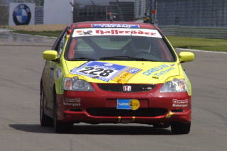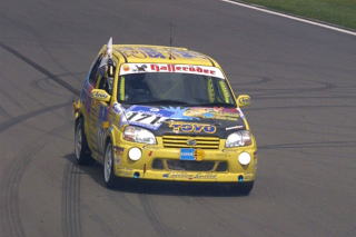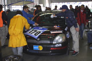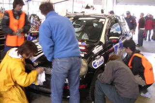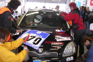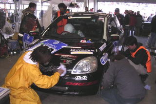 トップを行くワークスBMWがフォーメーション体制に入ったところでラスト30分! 一度ピットに入れて、ゴールへ向けての最終チェックとお色直しです。後ろは7周後ろのミニクーパーだから、あとはゴールまで行けば4位入賞! この際1周でも周回数を少なくしたいし、ここまで機嫌を損ねずノートラブルで走ってくれたヴィッツ君なんだから、最後くらい磨いてあげないとね。 残念ながらリタイヤに終わったアルテッツァのドライバーのみなさんから、観戦に来ていただいたスポンサーさんまで、みんなで磨いてくれました。申し訳ないことにオレはビデオ撮ってましたが(笑)。 心なしか、まわりのチームの人までニコニコです。 |