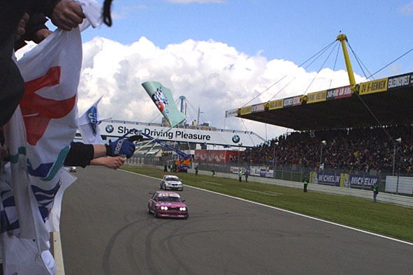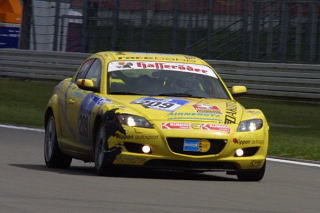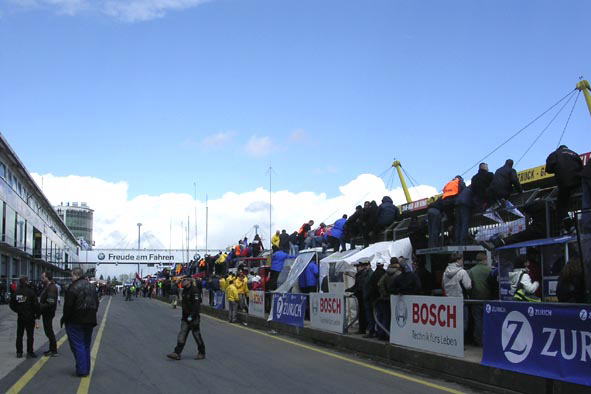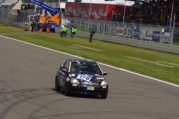 オールドコースの1コーナーです。 左の煙は火事じゃなくてニュル名物のバーベキュー煙です。観客席からだったらまだしも、アデナウの森のど真ん中のフラッグポストから煙が出てたときは倒れそうになったけど(笑)。 コースマーシャルだって長丁場だから、肉くらいは食わせてあげましょう。 ラスト1時間を切るとステッカーチューンならぬガムテープチューンを加えたマシンがいっぱいです(笑)。 |