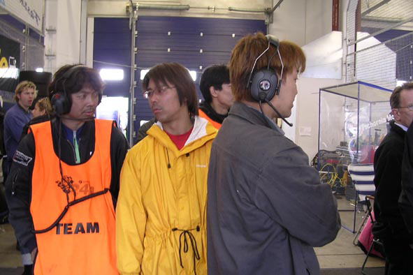 24時間最後のスティントに備えて、岸本さんにアドバイスするオレと、右フロントをのぞきこむT橋さん。 ここまで来ると、あと1時間半だったら大丈夫な気もするし、でもこの1時間半が一番怖いし、自信と不安が半々です。 |