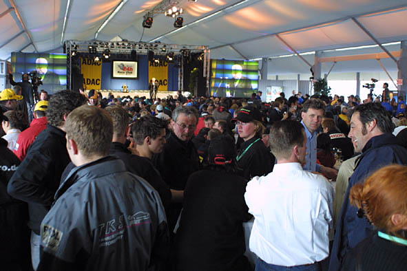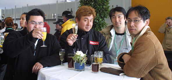 まあ見てくださいよ、この表彰式。会場をドカーンと作って、出たほぼ全チームが集まってお祭り騒ぎ! 暫定表彰で終わりの日本のレースとは全く違います。レースの中でもニュル24時間が特別なのかもしれません。 コース上ではいろいろあっても忘れてみんなで飲んだり食ったり(笑)。 各クラス上位3チームが呼ばれて(クラスの数が多いからすごーく長い)、トロフィーをもらいます。あとひとつだったけど、まあ今年はこのへんでカンベンしてやる! また来いってことですな。 撤収作業で出遅れたオレたちをテーブルに呼んでくれたのが、同じピットでシビックを走らせていたFLEPER MOTORSPORTS。「そんなところで何やってるんだよ、カンパ〜イ!」「オマエらも入賞したのか、カンパ〜イ!」「日本から来てよくがんばったな、カンパ〜イ!」とりあえず乾杯! |